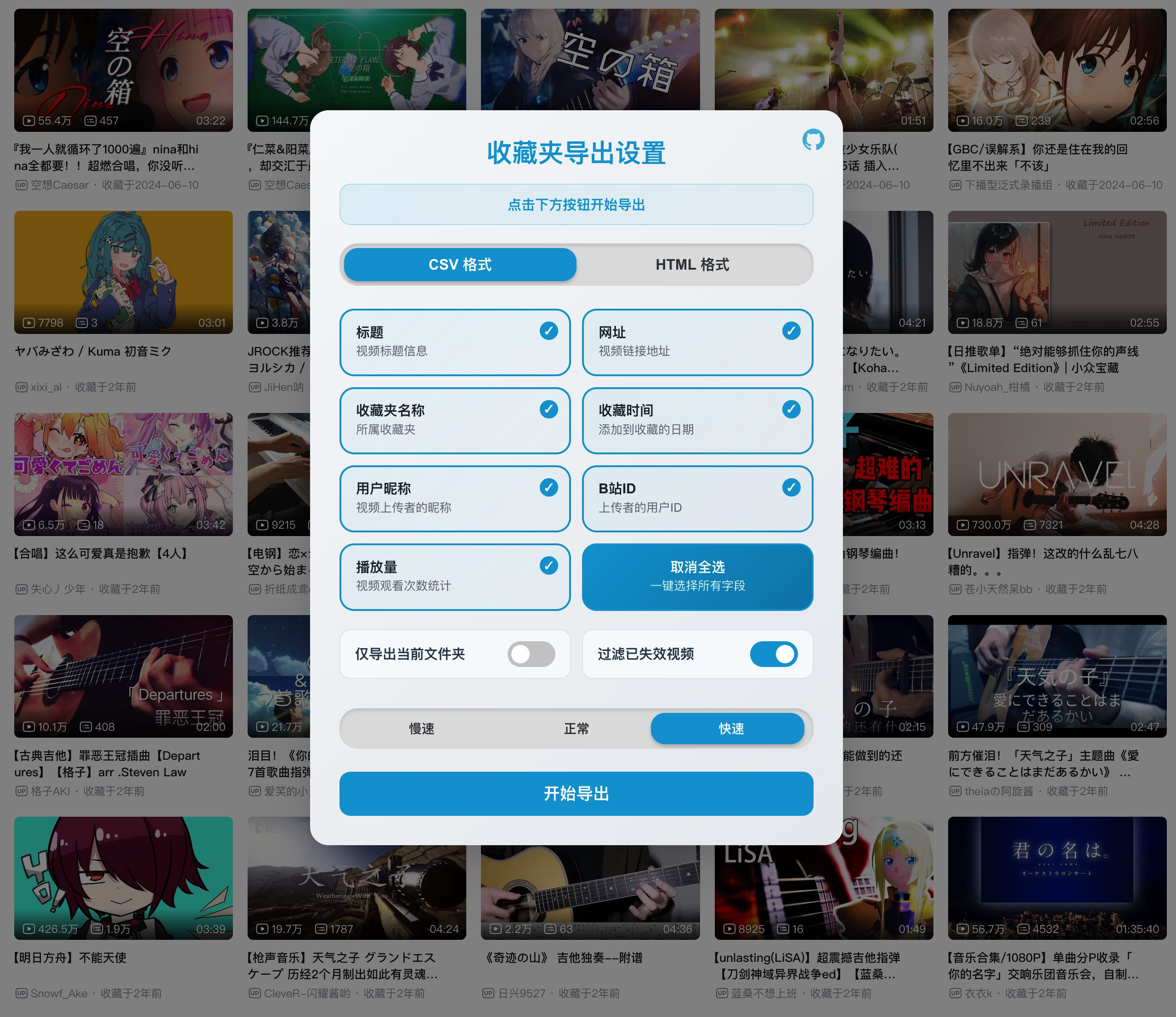 该插件导出的文件是 CSV,其中第二列就是我们所需的视频 URL。